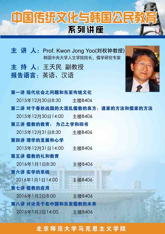 韩国中央大学人文学院院长、哲学系主任、儒学研究专家Prof.Kwon Jong Yoo(刘权忠 教授)应贝博官网王天民老师的邀请于12月30日至1月2日做为期4天的系列学术报告,报告主题“中国传统文化与韩国公民教育”,报告详细内容及具体安排详见如下海报。建议BB贝博艾弗森原官方网站研究生、博士后、访问学者和各位老师到场听取报告,积极参与交流,欢迎其他院系的广大师生前来交流切磋!