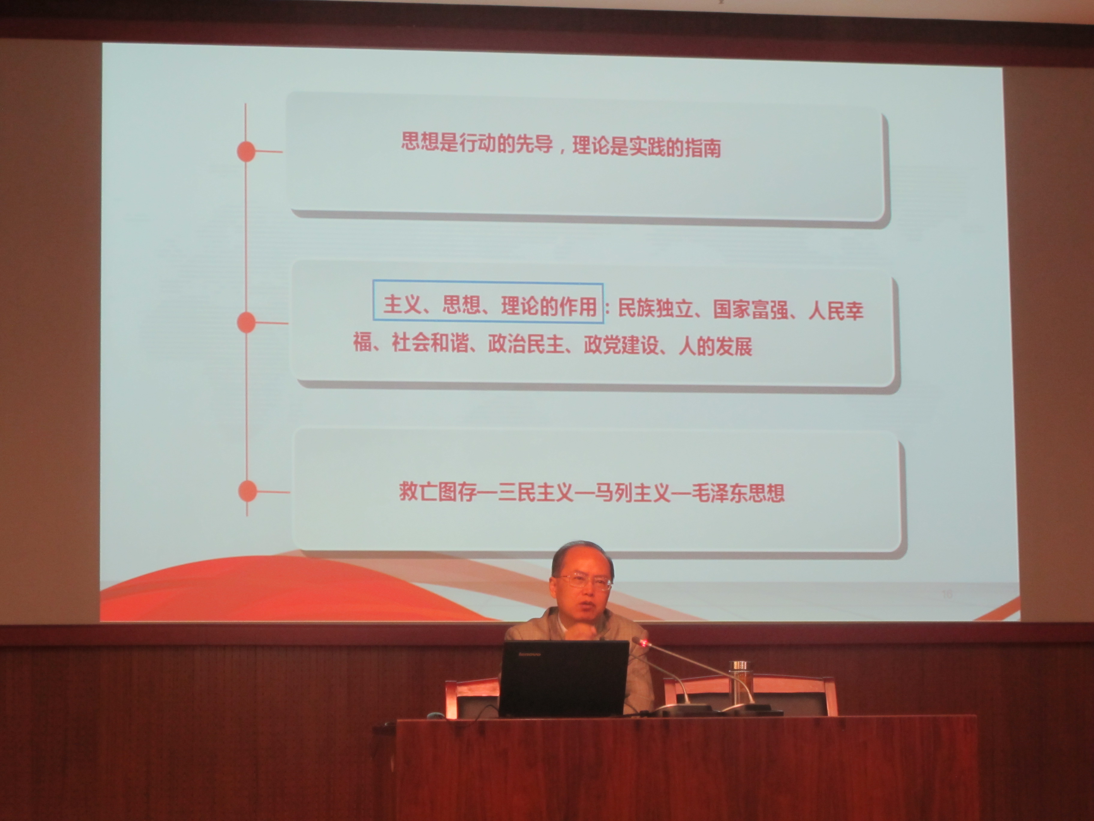 随后,王教授以王岐山同志“党纪严于国法”的表述作为引子,阐明“党章是从严治党的明镜”。他先介绍了严明党章党纪的重要性,接着围绕“坚定理想信念”谈了自己的观点。他先以习近平总书记关于理想信念的讲话开头,分析了共产党理想信念的科学内涵,其美好愿景是树立远大理想,要求党员掌握马克思主义理论,要求党员坚守政治红线与道德底线。王教授从“坚持远大理想与共同理想相结合”、“牢记马克思主义理论与党的宗旨”、“在实践中坚守政治红线与道德底线”三个方面具体讲解了党员应该如何坚定理想信念。其旁征博引,妙语连珠,赢得了现场观众的阵阵掌声。