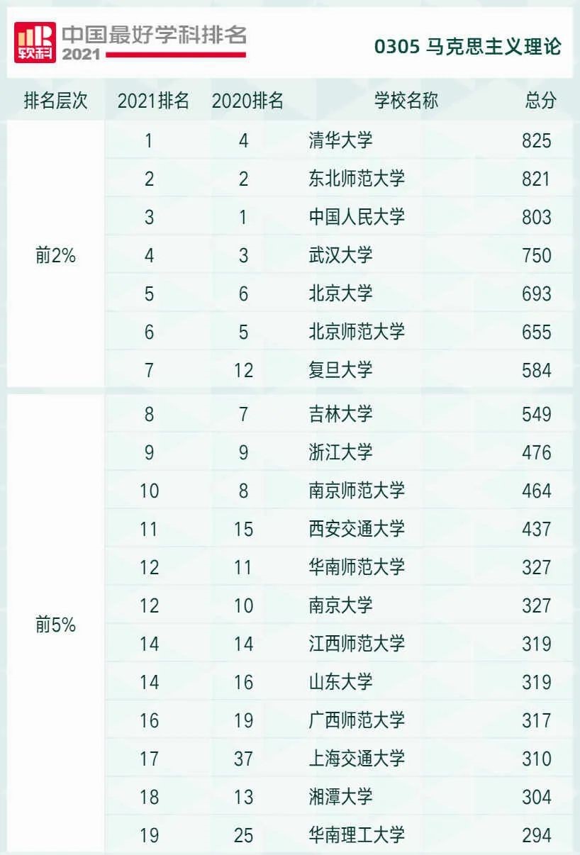 高等教育评价专业机构软科近日正式发布“2021软科中国最好学科排名”。排名榜单包括96个一级学科,各个学科排名的对象是在该一级学科设有学术型研究生学位授权点的所有高校,发布的是在该学科排名前50%的高校。共有486所高校的4992个学科点上榜。 马克思主义理论学科排名共有201所大学上榜,其中BB贝博艾弗森原官方网站与清华大学、东北师范大学、中国人民大学、武汉大学、北京大学、复旦大学等位列前2%。 来源:软科公众号