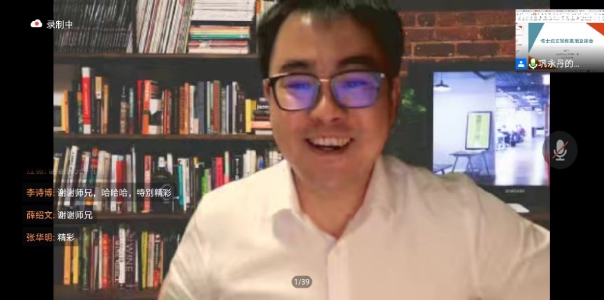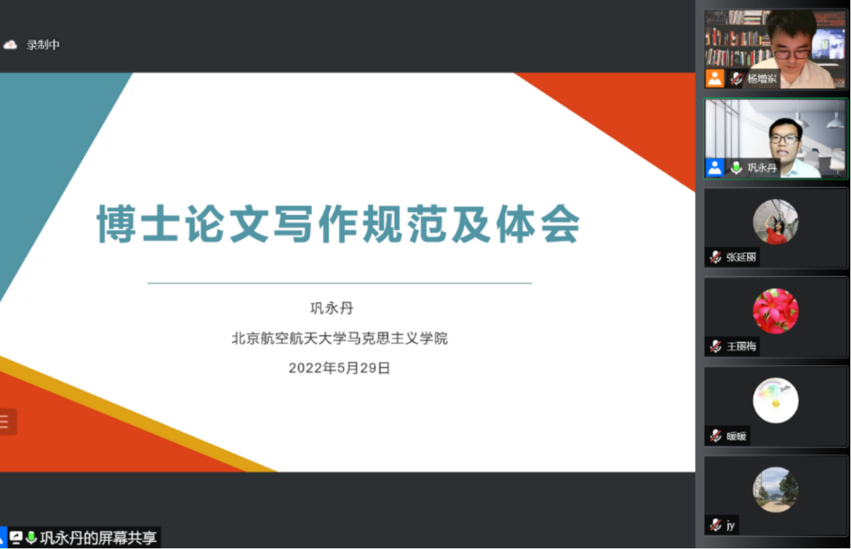 2022年5月29日,BB贝博艾弗森原官方网站线上举办“研究生学位论文指导系列讲座”第一讲。本次讲座聚焦博士学位论文写作,由贝博官网博士毕业并分别获得“首届全国高校马克思主义理论学科优秀博士学位论文”、“BB贝博艾弗森原官方网站优秀博士学位论文”的北京工业大学BB贝博艾弗森原官方网站副教授陈艳飞、北京航空航天大学助理教授巩永丹两位老师做分享。讲座以腾讯视频线上方式进行,学院博士生、部分硕士生以及校内外其他同学约320人在线学习。学院副院长杨增岽教授主持了讲座。 陈艳飞副教授以“博士学位论文写作的三境”为主题,围绕博士论文写作历程,从论文选题确立、初稿撰写以及修改完善三个环节就如何撰写学术论文进行了精彩的讲授。陈老师认为博士论文选题要以“高”“尽”“独”为遵循,养成关注各类学术信息的良好习惯,并善于在研究中确定研究方向。同时在论文撰写过程中,要从核心概念界定、研究框架确立、写作资料搜集等方面下足功夫。最后,陈老师还为同学们介绍了PROCESS ON等实用的论文写作与分析工具。 巩永丹助理教授以“马克思主义理论学科博士论文写作规范”为主题,以马克思主义基本原理专业博士论文写作为例,提出“阅读经典是基本功,选好题目是硬道理,用好文献是要选择,守好规范是大前提,选对方向是关键点,最终通过是总目标”的论文写作要求。巩老师提出阅读经典的三层次即拓宽阅读的面,确定阅读的点,连接阅读的线,同时指出在选用文献的过程中对最新研究成果要做到批判性吸收。最后还从论文写作规范、送审、提交等方面提出了需要注意的问题。 两位分享嘉宾还认真选答了参会同学的的提问。整个讲座受到广泛好评。 讲座最后,杨增岽老师对两位老师的分享交流表示衷心感谢,从四个方面总结概括了分享嘉宾在写作博士论文过程中的共性优点;结合近年来博士学位论文评阅与论文抽查的情况做了介绍,认为不同的目标要求和自觉意识决定了对待学位论文的不同态度;指出博士学位论文写作从打心底里喜欢做学术研究进而确立一个好的选题作为开始,是博士生的学养、学识、学风与研究能力的集中反映,选题过程是学术旨趣、选题价值、个人能力、导师关注等多重因素有机结合从而做出最佳决定的过程。杨老师同时指出,研究方法、研究思路与研究结论要经得起逻辑推敲,要在循序渐进上下功夫,任何“一招鲜”或“绣花拳”都是难以为继的;勉励大家进一步增强学位论文的重视度,尽早进入写作最佳状态。杨老师表示,学院将进一步为博士生写好学位论文提供积极指导,后续还将陆续采取多种形式深入开展专题论文写作指导。