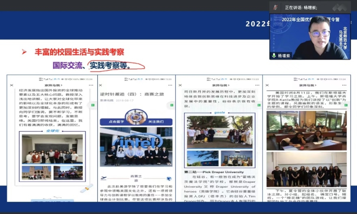 2022年7月8日至10日,学院成功举办“2022年全国优秀大学生夏令营”,来自全国33所高校的56名有志于从事马克思主义理论、中共党史党建学习研究的优秀大学生相聚云端,通过线上会议的方式参加了本次夏令营活动。 学院党政领导班子参加了开营仪式,张润枝院长致辞并详细介绍了学院基本情况,希望同学们通过本次夏令营活动,加深对BB贝博艾弗森原官方网站的认识和了解,增强学术兴趣,找准学术方向,进一步深化对马克思主义理论、中共党史党建学科的认识和理解。开营仪式由杨增岽副院长主持。 开营仪式结束后,学院党委书记亓振华,副院长杨增岽分别就学生党建与思政工作情况、研究生培养与课程体系进行了详细介绍,并解答了学生的疑问,帮助参营同学进一步了解学院研究生培养动态。 在学术报告环节,王树荫、赵朝峰两位教授分别作了题为《中国共产党百年思想政治教育研究方法论》《中国共产党和中华民族伟大复兴》专题学术报告,并与参营学员展开交流互动。两场学术讲座主旨鲜明、逻辑清晰、视野宏阔、语言生动、深入浅出,体现了学术性、思想性、政治性的统一,开拓了参营学员的学术视野,激发了参营学员们对马克思主义理论、中共党史党建的学习研究兴趣。 在学科专业介绍与交流环节,肖潇、田毅松、李娟、邢国忠、袁红、王峰、李晓东等七位老师分别结合马克思主义基本原理、马克思主义发展史、马克思主义中国化研究、思想政治教育、党的建设、党的历史与理论、学科教学(思政)7个专业的基本概况、研究方向设置、师资力量、培养举措、就业方向等情况向参营学员进行了详尽介绍,并与参营学员积极开展交流、答疑解惑。夏令营举办期间,学院还按小组分别组织营员笔试测试和综合面试,加强了师生间的相互了解。 10日下午,在夏令营闭营式上,杨增岽副院长对此次夏令营活动做出全面总结,杨老师希望参会营员能够一如既往地关注BB贝博艾弗森原官方网站,进一步加强专业理论的学习,夯实研究基础,不断提升综合素质,并期待大家如愿进入心仪的专业学习深造。最后,杨老师对优秀营员评选事项作出全面说明,衷心感谢支持并参与此次夏令营活动的全体师生。 今年贝博官网全国优秀大学生夏令营报名人数是近年来最多的一年,并且也是贝博官网自主培养的本科生首次参与的一年。本次夏令营活动促进了来自全国不同高校的优秀大学生之间的交流沟通,增强了同学们对BB贝博艾弗森原官方网站的认识和了解,帮助学生坚定了选择北师大的信心和决心,有效提升了贝博官网2023级硕士研究生招生的生源质量。夏令营活动结束后,学院为每一位营员学生颁发了参营证书。